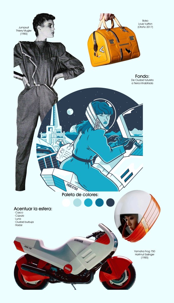 (esp) «Ladrona del futuro» es una ilustración de una mujer mirando atrás mientras escapa con un bolso repleto de billetes. Cada detalle es importante, así que busque referentes para crear una buena atmosfera: el mono de Thierry Mugler, el prototipo de moto de Yamaha, el bolso de Louis Vuitton, … un estilo retrofuturista.