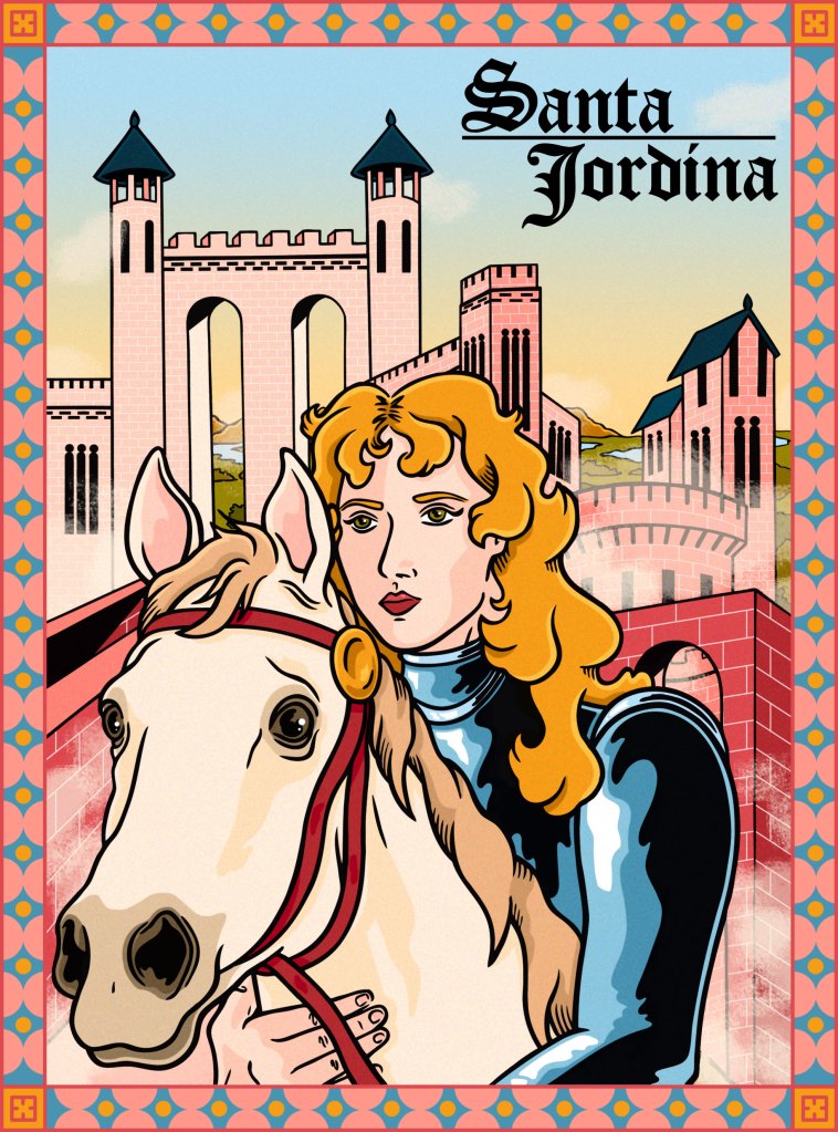 In the foreground, you’ll see Santa Jordina with her horse. In the background stands the giant, labyrinthine castle. Gothic medieval paintings inspired me in choosing the color palette.
