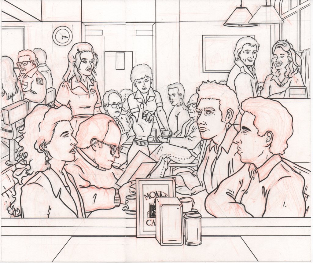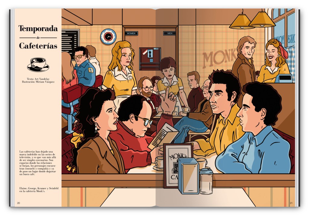 Para la cabecera del artículo «Temporada de Cafetería», he ilustrado al elenco de la serie Seinfeld dentro de la cafetería Monk’s, en Nueva York. En primer plano están Elaine, George, Kramer y Seinfeld en su mesa habitual, pero, como gran admiradora de la serie, no he podido resistirme a dibujar también a Newman, Kenny Bania, Tim Whatley e incluso al propio Larry David.