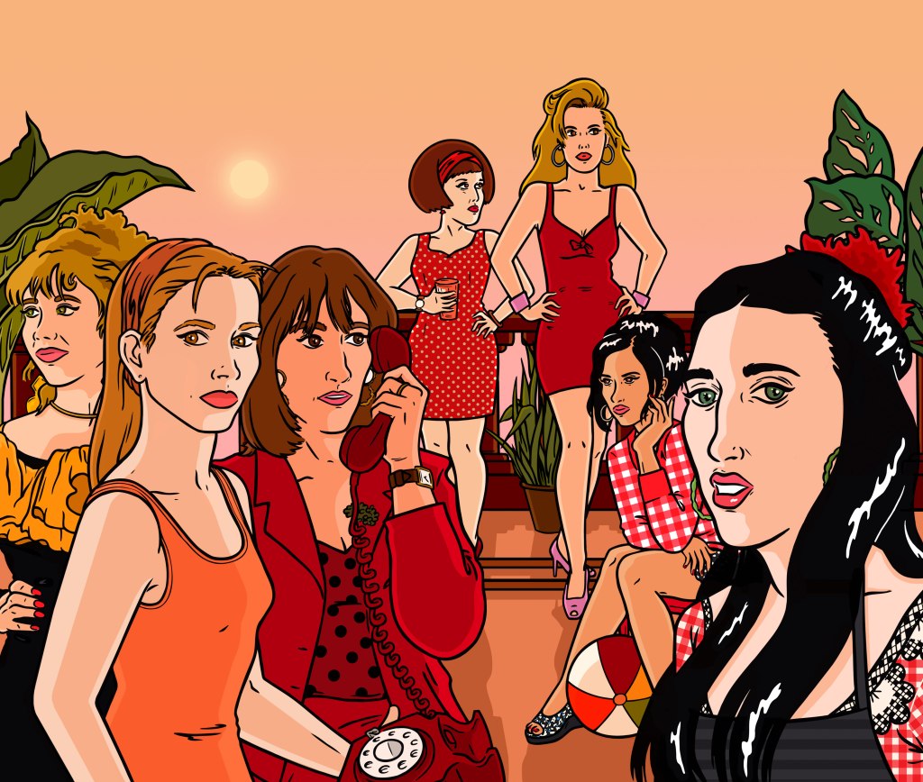 The female empowerment portrayed by Almodóvar is reflected through fashion: tailored suits, short dresses, polka dots, gingham checks, and lots of red are the visual elements highlighted in this illustration.