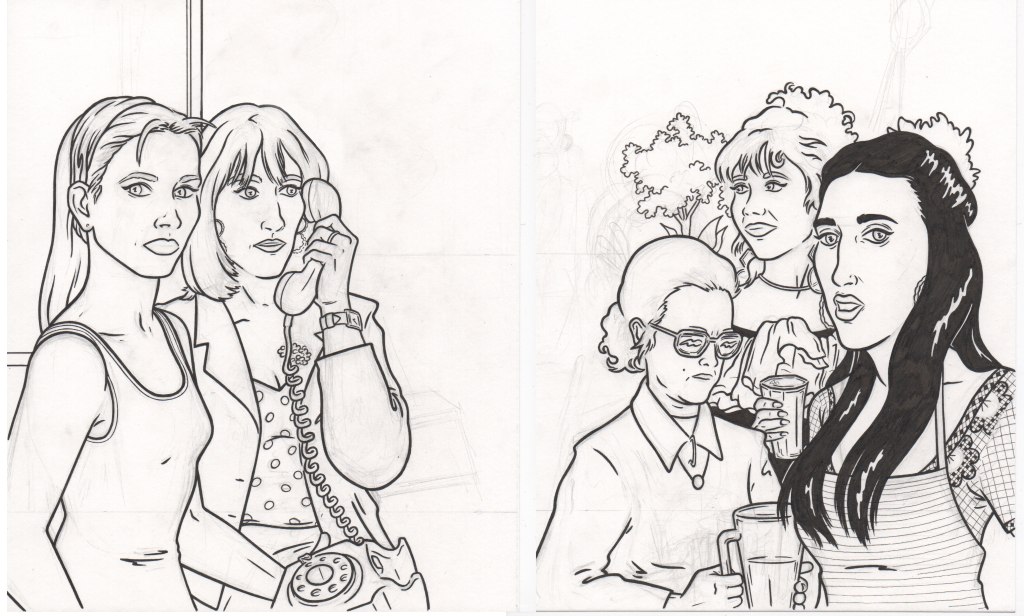 (esp) El empoderamiento femenino que retrata Almodóvar se refleja en el vestuario: trajes chaqueta, vestidos cortos, lunares, cuadros vichy y mucho rojo son los elementos que se han querido destacar en esta ilustración.
