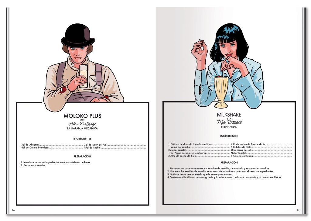 (esp) Mientras Jeff Lebowski, “el Nota”, se prepara un ruso blanco siempre que tiene ocasión (The Big Lebowski, 1998), Mia Wallace no duda en pedir un batido de cinco dólares. Mia, el Nota y Alex DeLarge están retratados con sus bebidas favoritas para el recetario de bebidas de película.